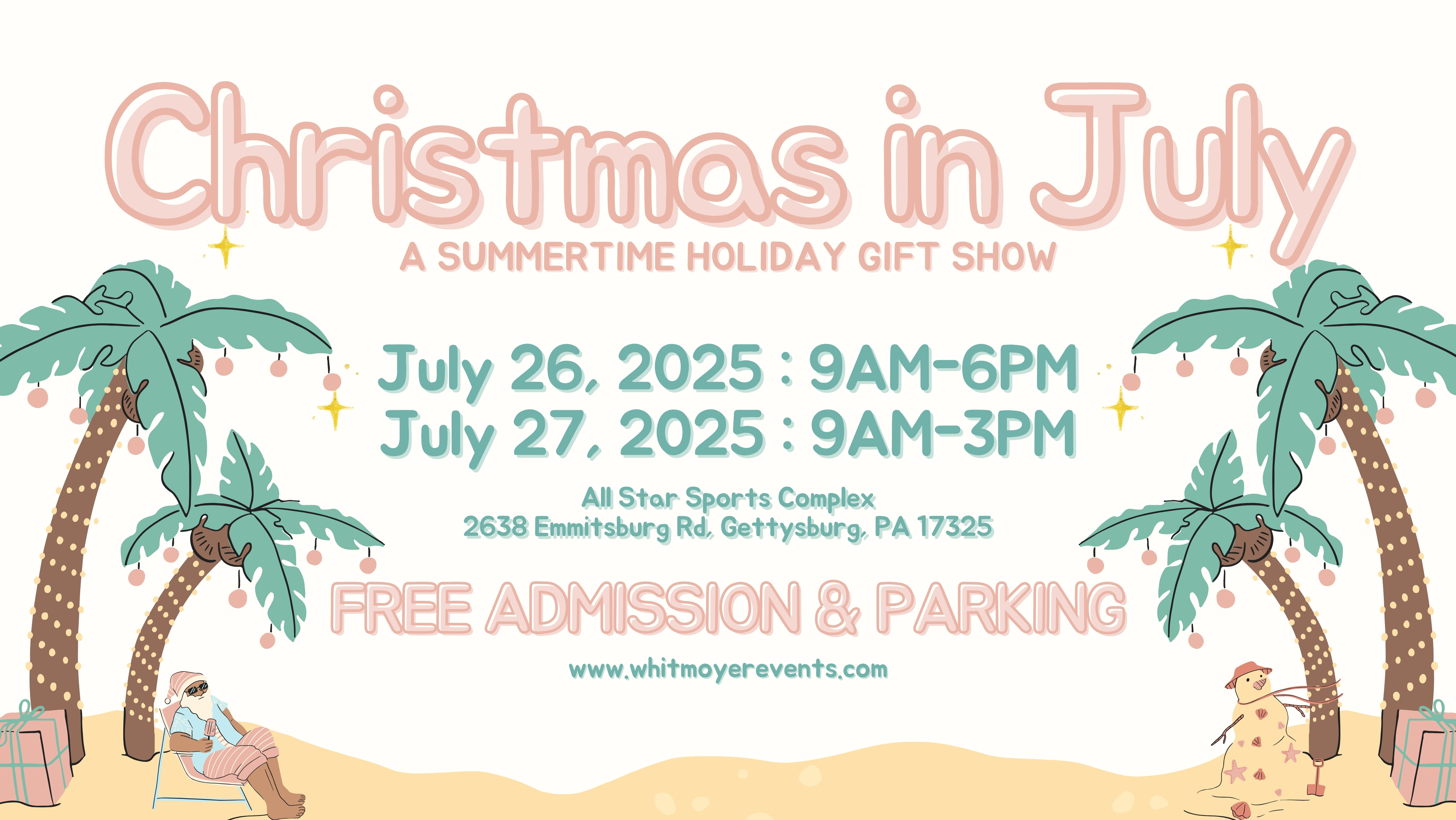 Join us for the 1st Annual Christmas in July // A Summertime Holiday Gift Show // Gettysburg, PA 2025 on Saturday, July 26, 2025 from 9 a.m. to 6 p.m. and Sunday, July 27, 2025 from 9 a.m. to 3 p.m. at the All Star Sports Complex! This year’s event will host nearly 100 crafters and vendors. Our event is FREE admission and parking is free at the All Star.