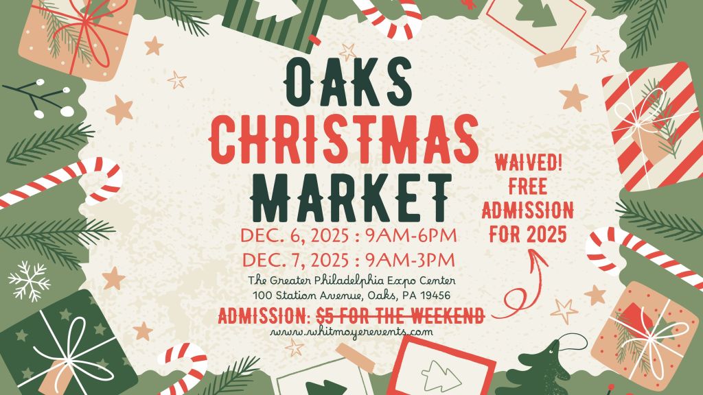 Join us for the 2nd Annual Oaks Christmas Market // A Holiday Gift Show, to take place Saturday, December 6, 2025 from 9 a.m. to 6 p.m. and Sunday, December 7, 2025 from 9 a.m. to 3 p.m. at the Greater Philadelphia Expo Center! This year’s event will host over 100 crafters and vendors in Hall C (please note: exact vendor count will be posted below). Our event is $5 admission WAIVED! FREE ADMISSION FOR 2025 for the weekend thanks to our generous sponsors: All American Gutter Protection, Best Contracting LLC, Condo Travel, LeafFilter Gutter Protection, Leaf Guard, Pella Windows & Doors, Power Home Remodeling and Volpe Enterprises, Inc. Parking is free at the Expo Center; there is over 5,000 parking spaces at the Expo Center. If you have any issues with parking, please feel free to contact us.